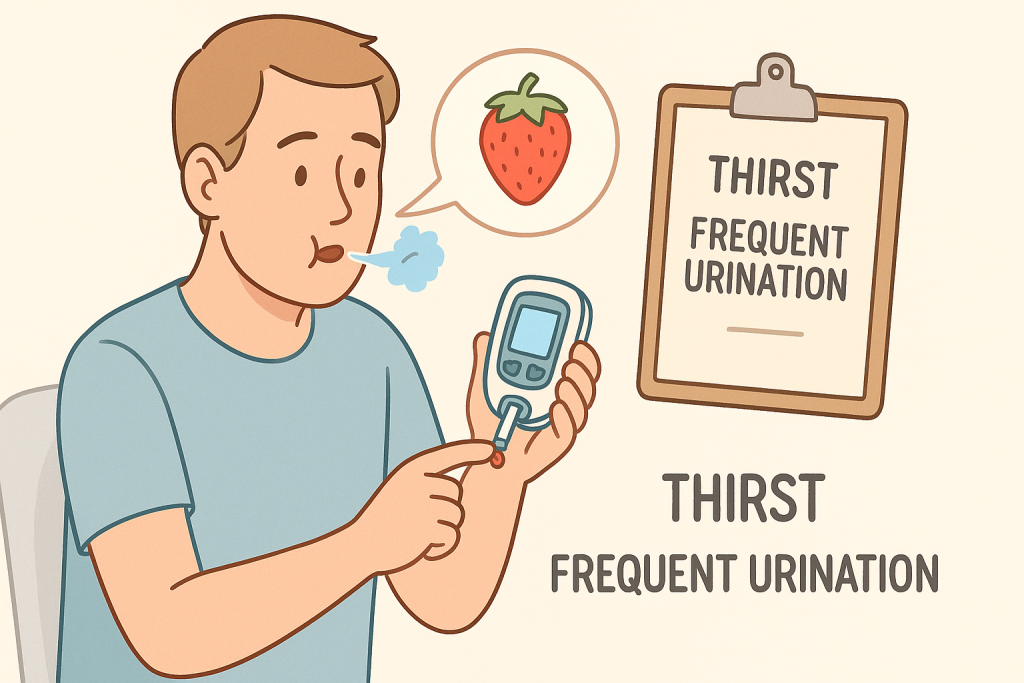 If you or a loved one with diabetes suddenly develops fruity breath, rapid breathing, nausea, or confusion, seek urgent or emergency care right away. Even without known diabetes, persistent fruity breath is a reason to ask for a blood sugar check.