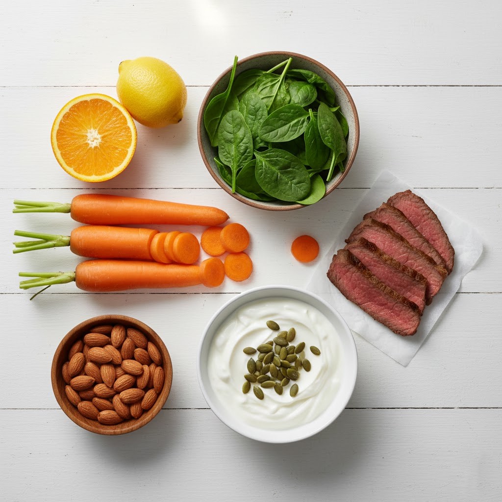 For minerals, iron-rich foods like lean beef, lentils, and fortified oatmeal can help support energy levels. Magnesium is abundant in almonds, pumpkin seeds, and whole grains, while zinc appears in turkey, chickpeas, and Greek yogurt. Even adding just 1 oz of pumpkin seeds provides roughly 20% of the Daily Value for magnesium—a small but impactful choice.