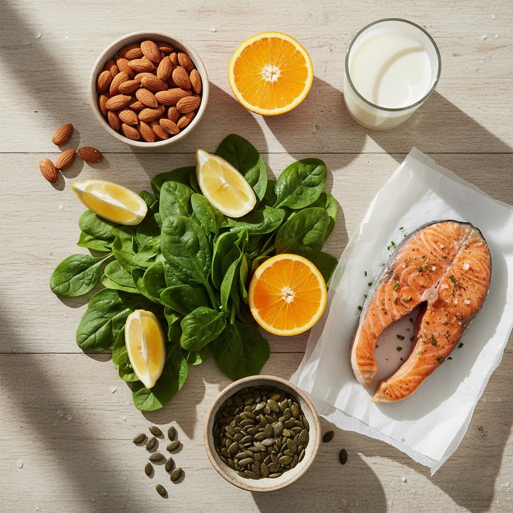 Fatty fish like salmon, fortified milk or plant-based alternatives, and eggs offer small amounts of vitamin D. However, most adults do not reach ideal levels from food alone. Brief sun exposure and supplements—when recommended by a provider—are often more effective.