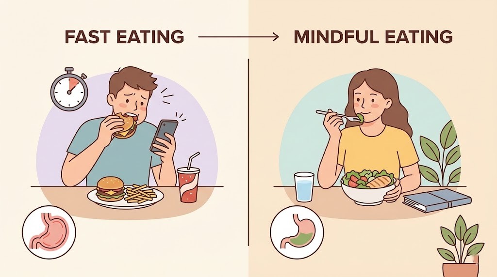 A practical starting point is slowing down mealtimes. Instead of rushing through lunch, set a 15-minute timer and aim to chew each bite 5–10 times more than usual. This mindful eating method can reduce overeating and help your stomach signal fullness earlier. If evenings are busy, try prepping meals in advance so you can eat calmly instead of grabbing something on the go.