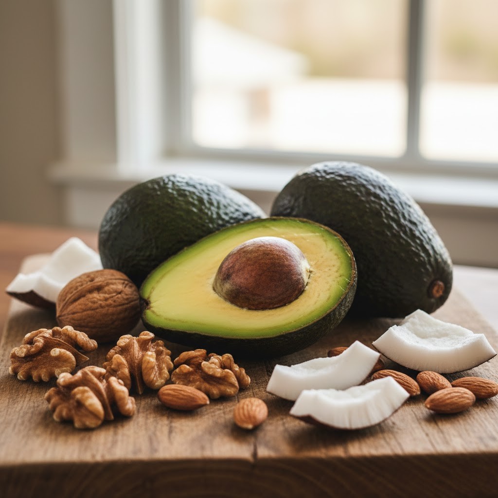 Yogurt, especially Greek yogurt, brings protein plus probiotics that may support a healthier scalp environment. A ¾-cup serving offers around 15–17 g of protein depending on the brand. Spinach offers a plant-based source of iron and folate, which help carry oxygen to the follicles and may support better growth. Avocado delivers monounsaturated fats that support shine and softness; half an avocado a few times a week can noticeably improve moisture. Coconut—whether coconut flakes, coconut milk, or small amounts of coconut oil—adds healthy fats that support shine and protect hair from looking dull.