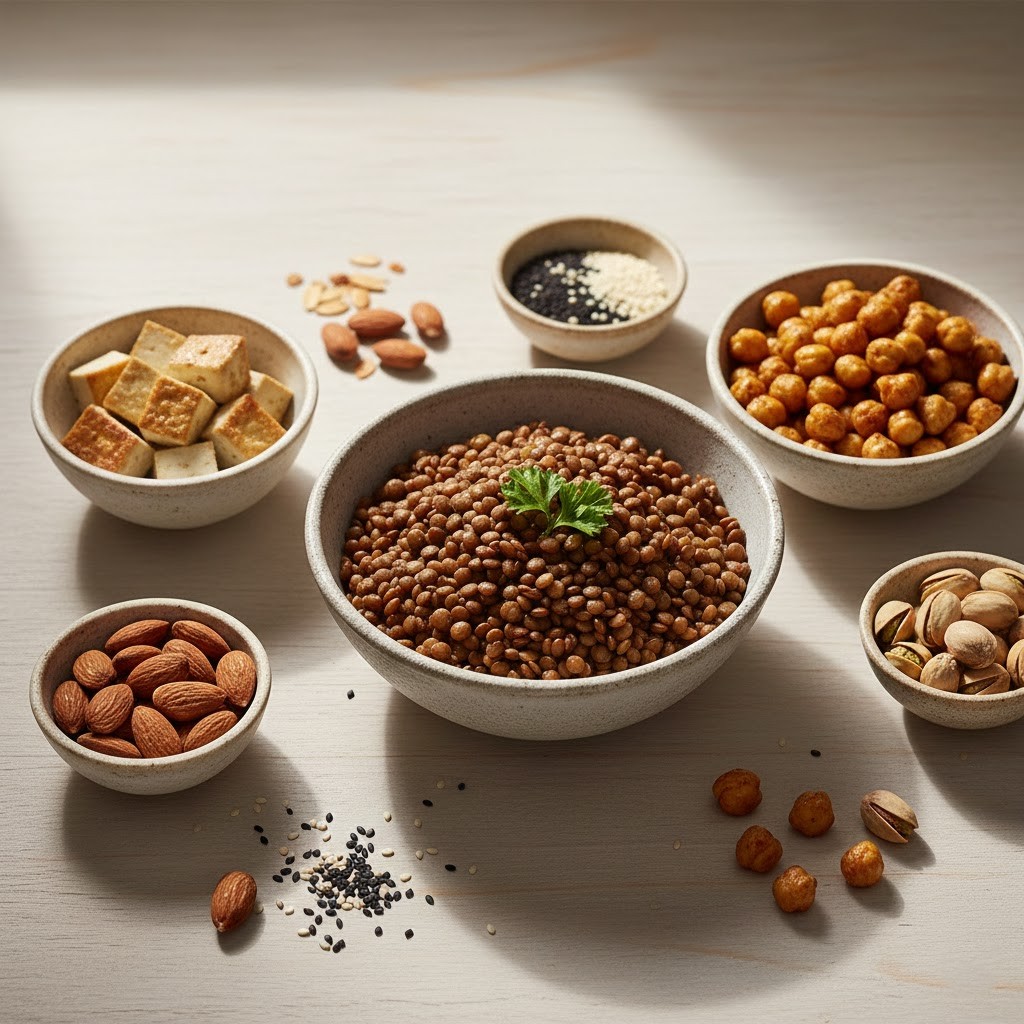Plant-based options (legumes, tofu, nuts, seeds, cabbage, raisins)