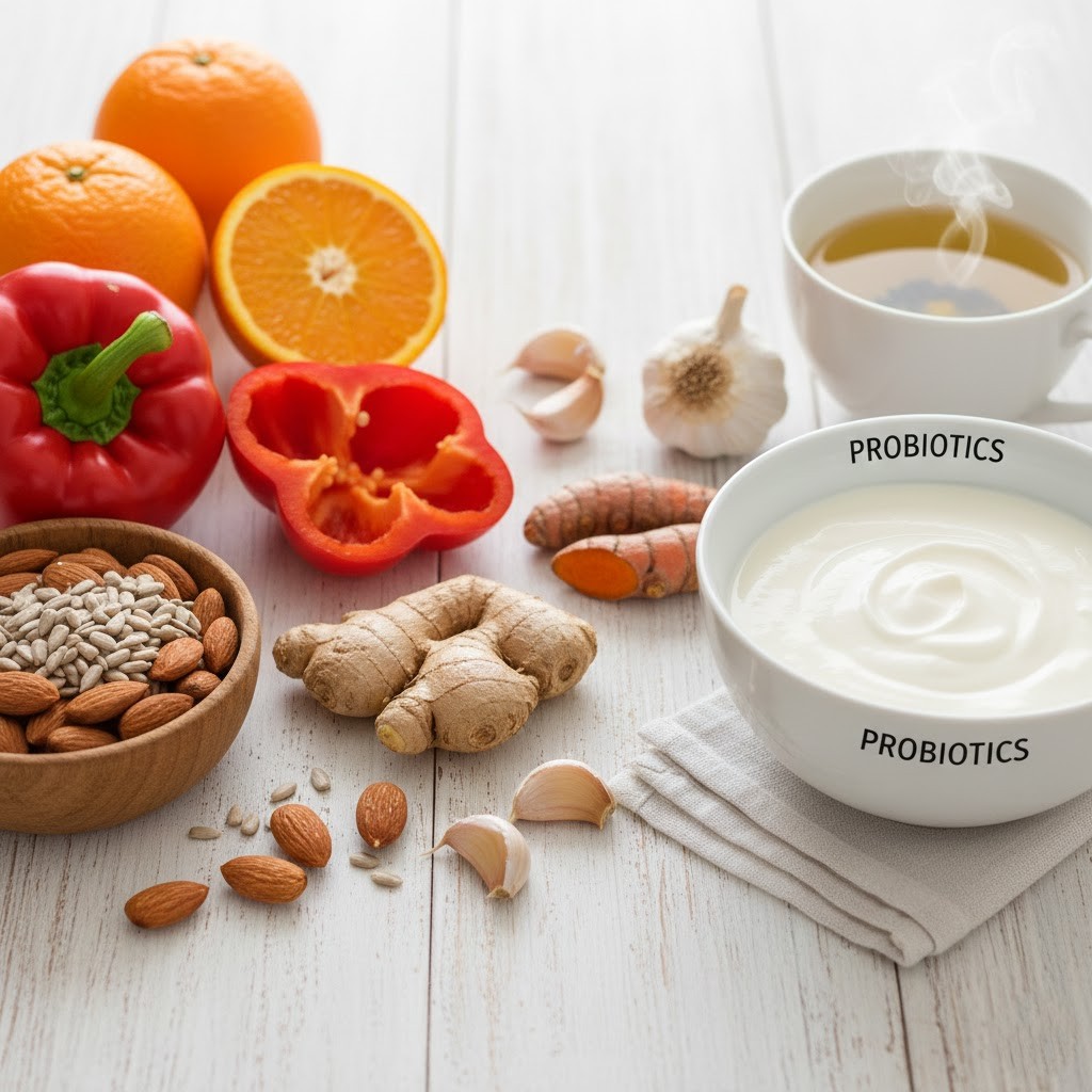 Zinc supports immune cell development and communication. Foods like yogurt, seeds, beans, and nuts contribute small but meaningful amounts—¼ cup of sunflower seeds contains about 2.5 mg. Probiotics from yogurt and fermented foods help maintain gut balance, which plays a role in immune health. Plant compounds found in garlic, turmeric, and green tea provide additional antioxidant and anti-inflammatory support.
