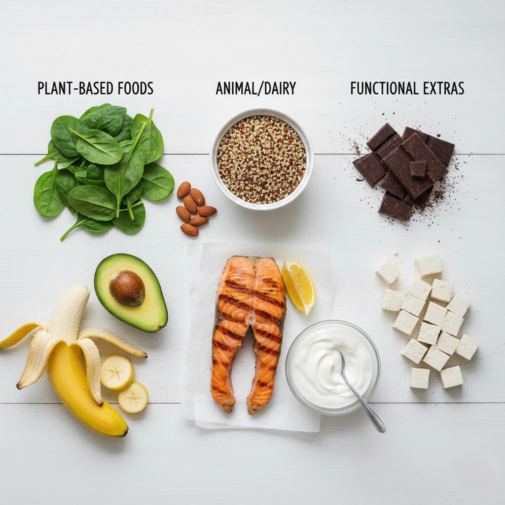 Plant-based sources (spinach, almonds, quinoa, avocado, banana)
