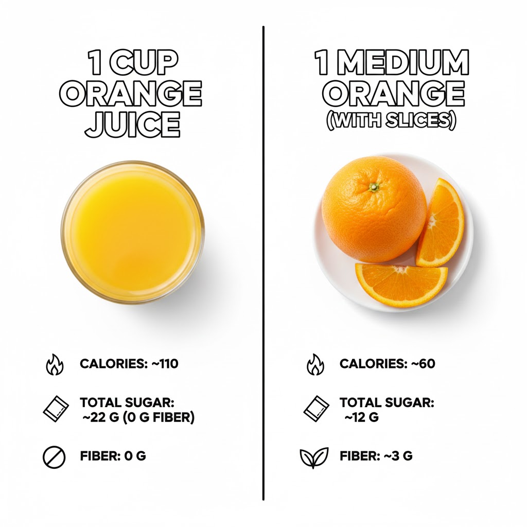 A typical comparison is 1 cup (8 fl oz) of 100% orange juice versus 1 medium orange. Juice provides about 110–130 calories, while a whole orange has closer to 60–70 calories. The juice often represents 2–3 oranges squeezed into one glass, which concentrates calories and sugar. When you eat a single orange, you naturally stop at one fruit instead of consuming multiple at once.