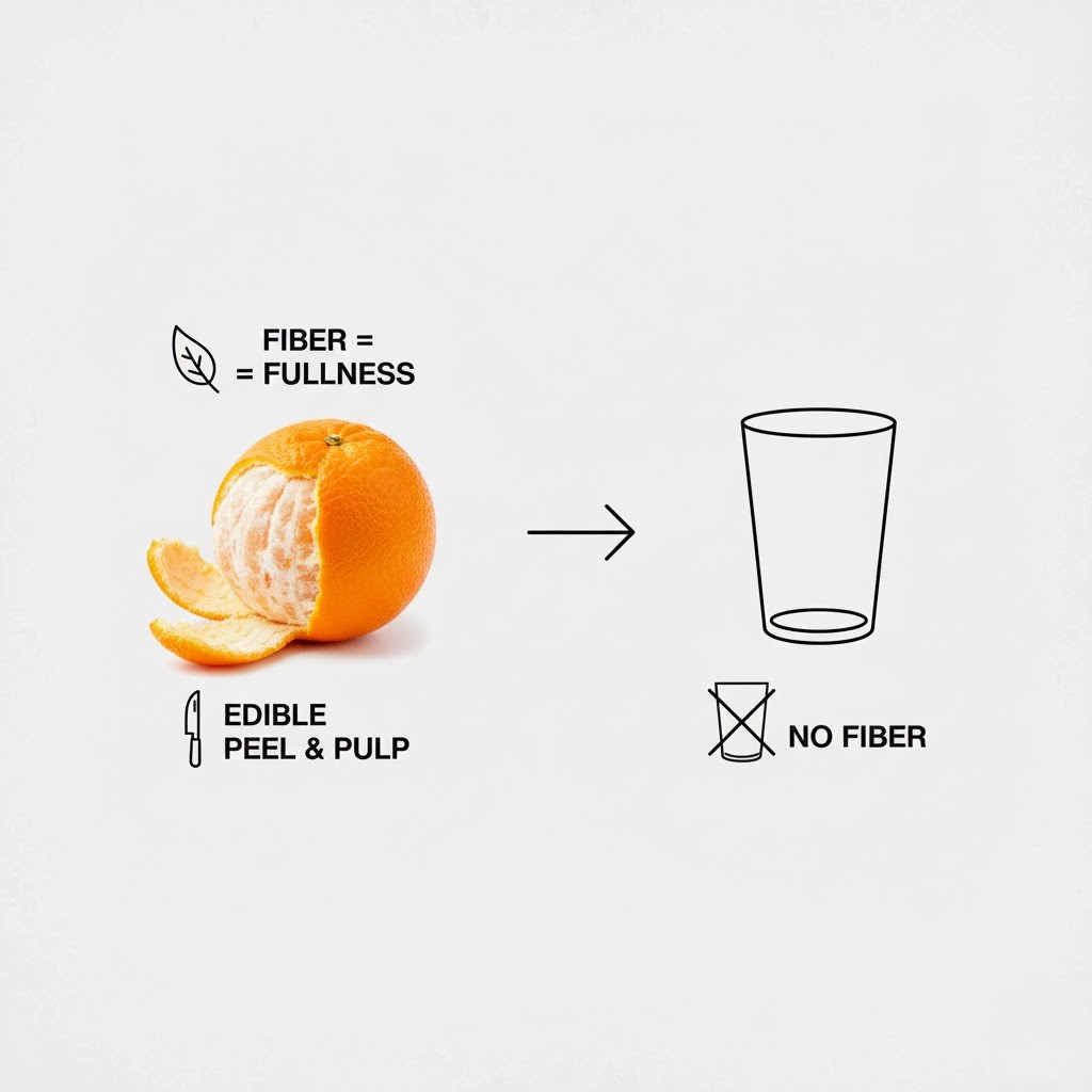 Fiber is the main nutritional divider. A medium orange (about 5 oz) contains roughly 3 grams of fiber, while 1 cup (8 fl oz) of orange juice has almost none. That fiber slows digestion, helps you feel full, and moderates how quickly sugar enters your bloodstream. Without fiber, juice behaves more like a sweet drink than a fruit. For example, drinking 1 cup of juice takes seconds, but eating one orange takes several minutes and requires chewing, which also supports satiety.
