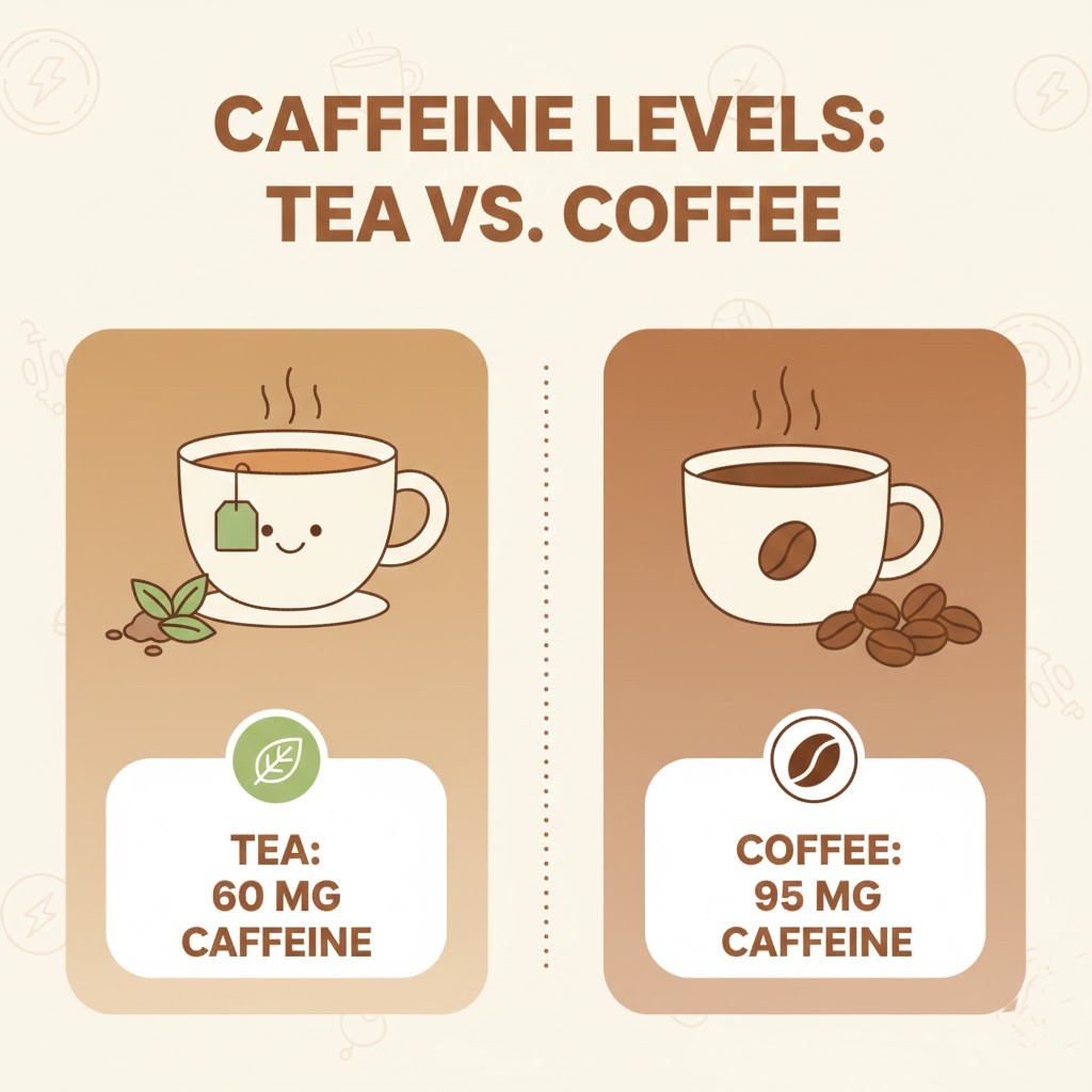 Tea generally provides a gentler lift because its caffeine content is about 60 mg per cup. Many people find this steadier and easier to manage compared to the stronger spike from coffee.