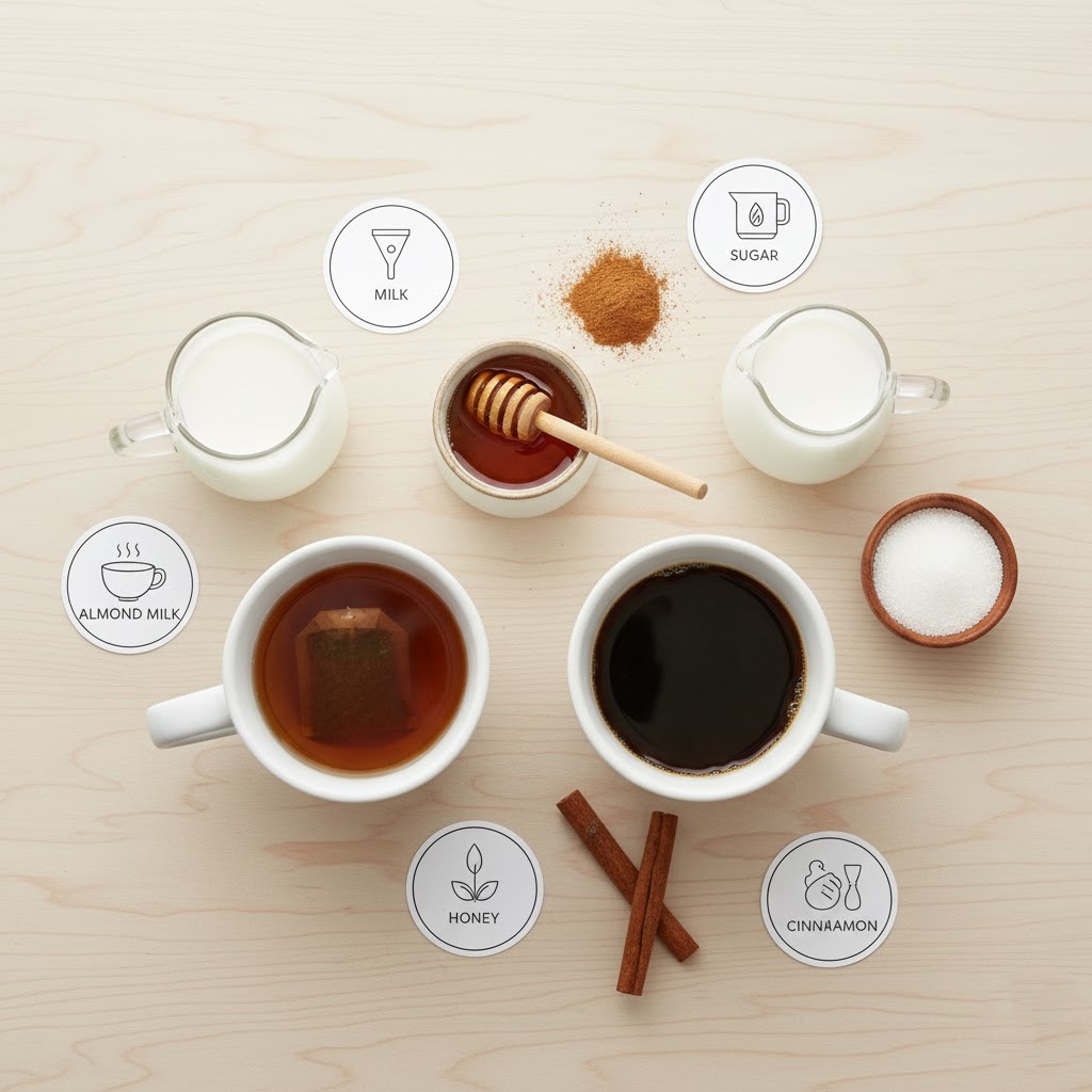 Calories and macros can play a surprisingly big role in your daily drink choice. Plain coffee by itself has almost no calories, but the popular café-style version shown in the comparison graphic—coffee with milk and 9 g of sugar—comes in at about 30 calories per cup. In contrast, the tea version shown carries 95 calories, mostly due to the added milk and sugar.