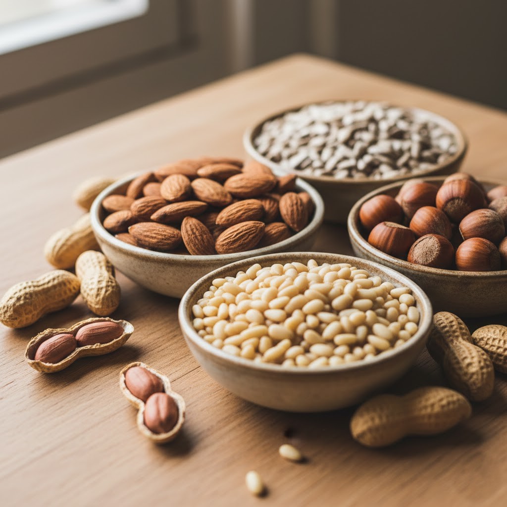 Nuts and seeds: almonds, sunflower seeds, pine nuts, hazelnuts, peanuts